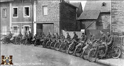 ADVERTISEMENTS ADVERTISEMENTS You are viewing a suspected one of a kind photograph that is featuring 2nd Engineers at Engers, Germany. We’ve noticed cool details, such as the 2nd Division Insignia painted on the motorcycles. Click the link for more details and photos. The Croix de Guerre on their Motorcycles